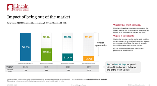 To illustrate this, the chart below from Lincoln Financial shows what happens when you try to time the market and miss the best days. The chart tracks what would have happened if you had invested $10,000 in the S&P 500 between January 1, 2004, and December 31, 2023, and missed the best-performing days: